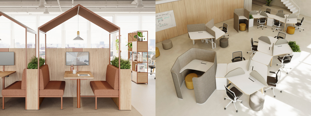 For office spaces requiring something more adventurous, the DM Meeting House (above, left) would be a terrific addition. The Meeting House is a configurable meeting space for collaboration and focus spaces within open environments. The product combines seating, tables, and optional acoustic elements, it helps encourage focused work zones and informal discussions. A range of options also includes TV / screen mount, cable management and decorative planter.