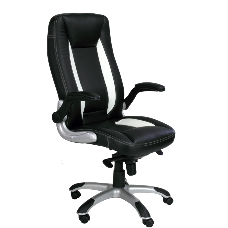 2-Tone Leather effect executive chair with a synchro knee tilt mechanism and foldable arms. Frame is finished in silver.