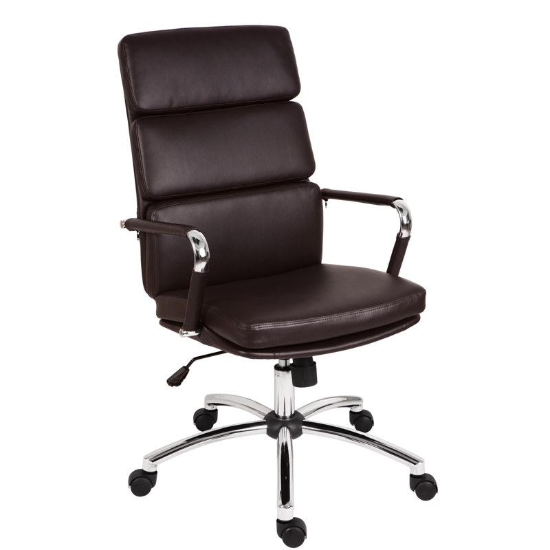 Executive chair with fixed arms and chrome frame. Tilt mechanism with tension control and upholstered in white, black, brown or red faux leather.