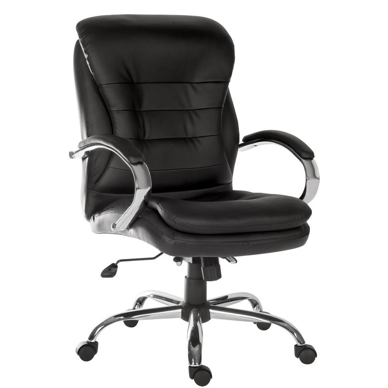 Executive chair with a chrome base and fixed arms. Tilt mechanism with tension control and upholstered in black faux leather.
