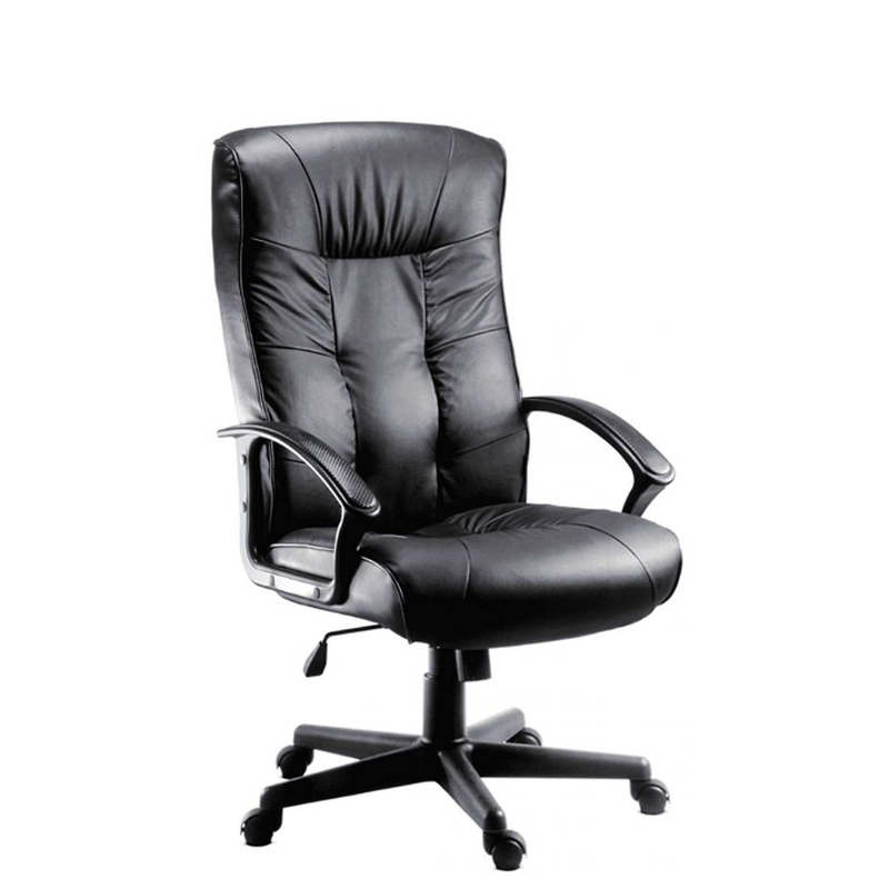 Executive chair with fixed arms and black base. Tilt mechanism with tension control and upholstered in black faux leather