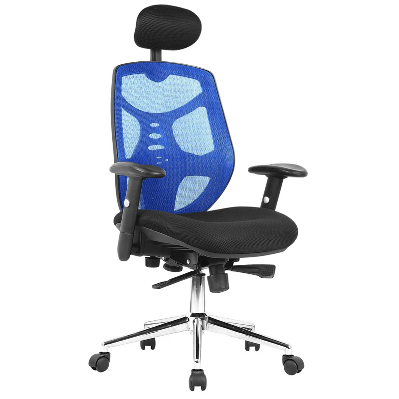 Black, red or blue mesh backrest with headrest and height adjustable arms.