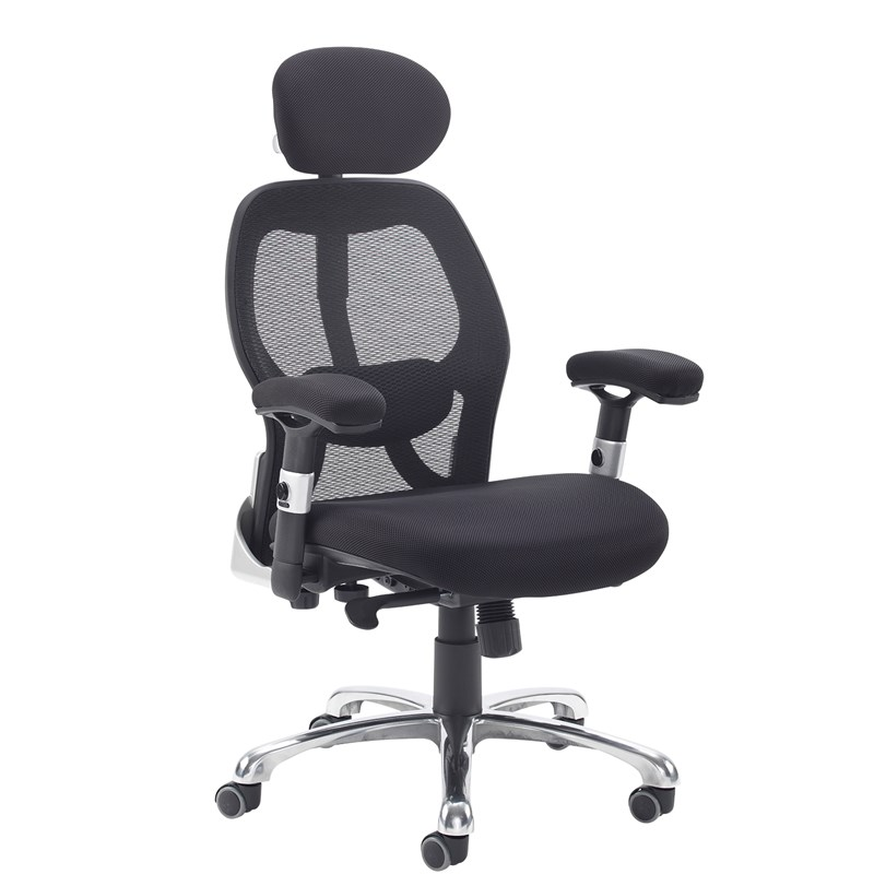 Deep padded air mesh seat and headrest with a mesh backrest. Synchro tilt mechanism with adjustable lumbar.