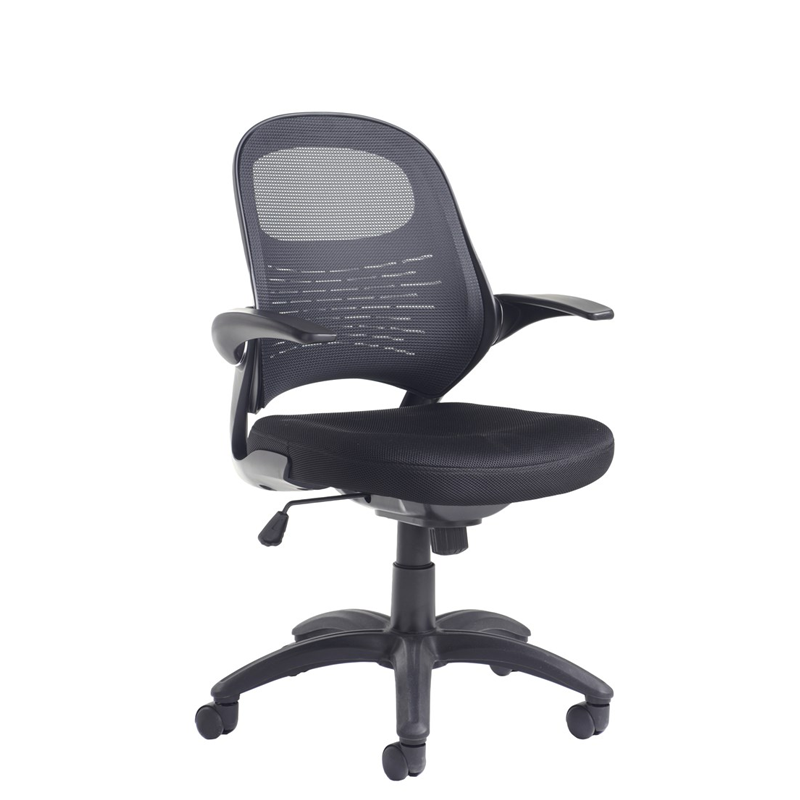 Knee tilt mesh chair with pivoting armrests.