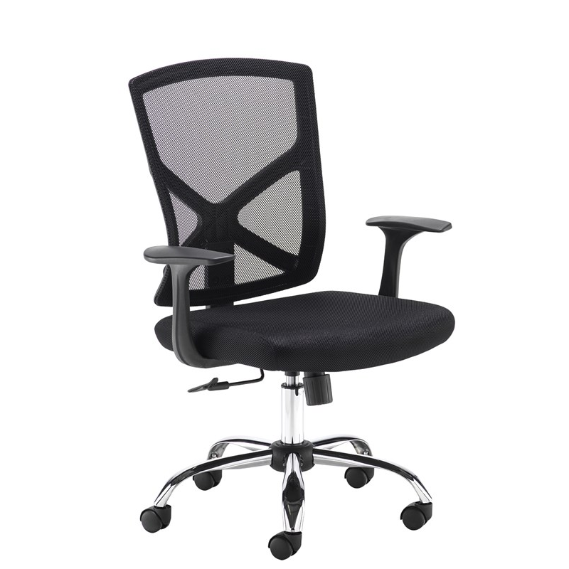 Mesh chair with a tilt mechanism, fixed arms and a chrome base.